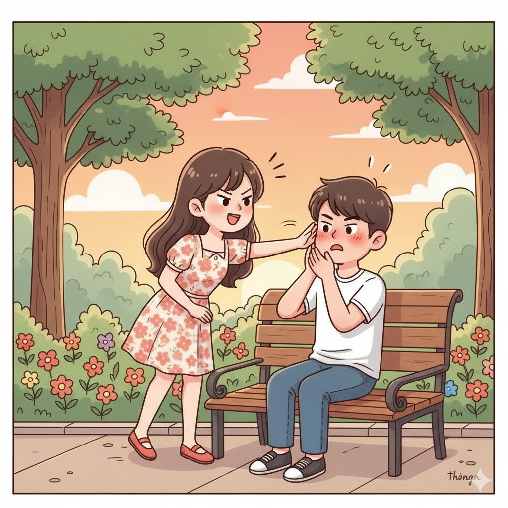 Cô gái nghe xong đứng bật dậy, giáng cho anh chàng một cái tát:
