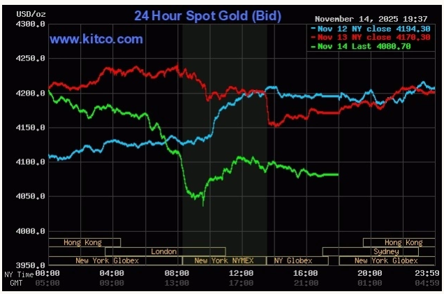 Chốt phiên giao dịch 14/11, giá vàng thế giới giao ngay giảm 90 USD xuống 4.080 USD. Trong phiên, giá có thời điểm xuống sát 4.030 USD.