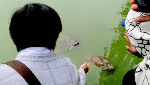 Cụ rùa bị thanh niên sờ đầu khi nổi