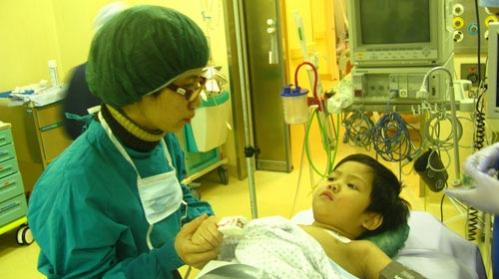 Thiện Nhân nắm chặt tay mẹ trước khi vào pḥng phẫu thuật tại Bệnh viện Bologna (Ư) đầu năm 2010 - Ảnh do gia đ́nh cung cấp