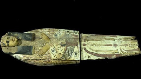 Xác ướp được đựng trong quan tài gỗ có trang trí hoa văn và tranh ảnh tuyệt đẹp cùng chữ tượng hình Ai Cập cổ đại.