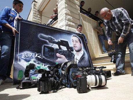 Một hướng đạo sinh (trái) cầm di ảnh của người quay phim Lebanon, anh Ali Shaaban, làm việc cho kênh truyền h́nh Al-Jadeed, trong tang lễ của anh ở làng Maysadoun thuộc miền nam Lebanon ngày 10/4. Binh sĩ Syria đă bắn chết anh Ali Shaaban vào đầu tuần này ở vùng biên giới giữa hai nước. Theo kênh truyền h́nh Al-Jadeed, khi đó anh Shaaban đang ở phía biên giới của Lebanon tại tỉnh Wadi Khaled ở phía bắc th́ binh sĩ Syria nổ súng vào xe chở đoàn phóng viên truyền h́nh. Ảnh: Reuters.