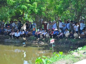 Hàng trăm người dân tụ tập quanh ao nước nơi phát hiện xác Thùy