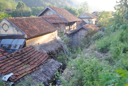 Đi sâu vào bản thấy thật buồn tẻ, cả năm nay bản Khe Choóng chẳng ai muốn sắm sanh hay tu sửa nhà cửa nữa vì họ sợ căn nhà của họ có ngày sẽ bị núi lở vùi lấp. Chúng tôi vòng ra phía sau núi thấy cảnh tượng thật kinh hãi, vết tích của vụ lở núi năm trước vẫn còn nguyên. Ở đây nham nhở những vết nứt giằng xé, đất đá đang treo giữa sườn núi có thể đổ ập xuống bản làng bất cứ lúc nào.