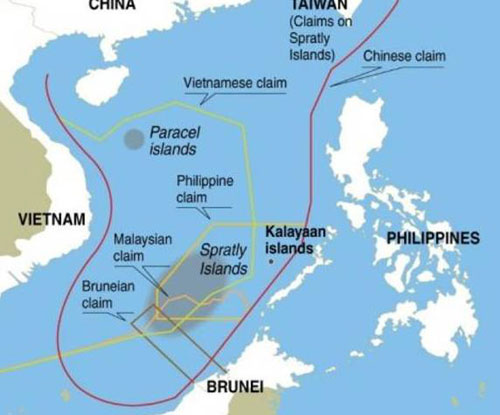 | Trung Quốc tuyên bố chủ quyền trên Biển Đông với diện tích được xác định bằng “đường lưỡi ḅ” (màu đỏ). |