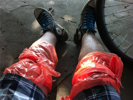 Buộc nilon chống cháy nắng khi vượt đường dài.