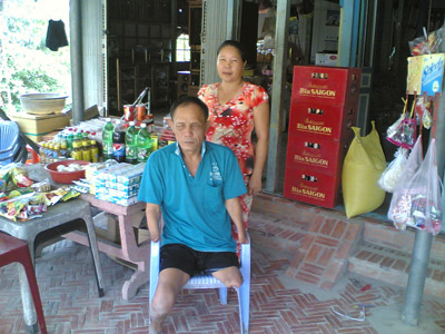 Thương binh Lê Phước Tứ và cửa hàng tạp hóa hôm nay (chụp hôm 5 tháng 8, 2012). Người đứng phía sau anh Tứ là cô em Lê Thị Diệu Hiền trong câu chuyện. (Hình: Gia đình anh Lê Phước Tứ cung cấp)