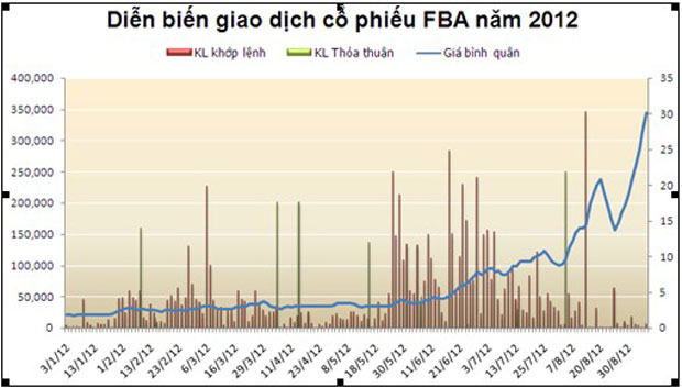Nhìn trên đồ thị, có thể thấy giá cổ phiếu FBA bắt đầu leo thang từ đầu tháng 7/2012, khi cổ phiếu này vượt qua được mức giá 10.000 đồng. Tương ứng với thời điểm này, khối lượng giao dịch cổ phiếu FBA sụt giảm khá mạnh. Điều này dẫn đến những nghi vấn về việc một nhóm cổ đông đã tích lũy đủ khối lượng cổ phiếu FBA cần thiết, rồi đẩy giá cổ phiếu “leo thang”. Đây là một hiện tượng thường thấy ở những cổ phiếu nhỏ, có giá trị vốn hóa không lớn. Ngày 7/9/2012, tổng giá trị vốn hóa của FBA là 103,129 tỷ đồng. Trong khi đó, số tiền mà nhà đầu tư bỏ ra để mua cổ phiếu FBA từ đầu năm đến nay chỉ là 48,8 tỷ đồng.