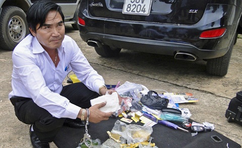 | Trùm ma túy Đậu Xuân Duyên khi bị bắt cùng với tang vật. |