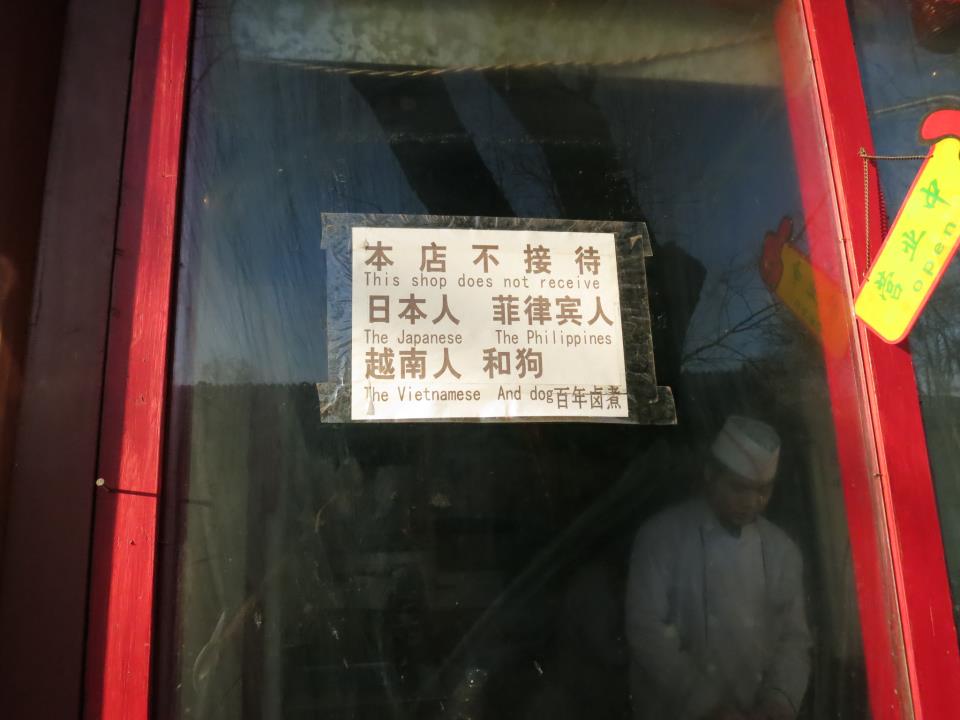Trên một trang mạng của Facebook, một người Rose Tang đã cho lên một bức ảnh với rất nhiều bức xúc. Trong bức ảnh là một cửa hàng. Trước cửa của cửa hàng có một tờ giấy ghi rõ: Trong tiệm này không không phục vụ người Nhật, Philippines, Việt và Chó. Dưới đây là bức ảnh về cửa tiệm: