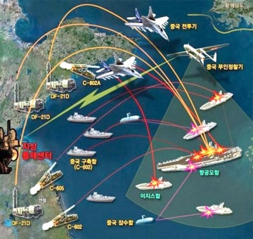 Sơ đồ mô tả chiến lược chống tiếp cận/chống xâm nhập của Trung Quốc.