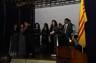 WESTMINSTER (NV) - Mặc cho nhóm người biểu tình la hét bên ngoài, khán phòng sinh hoạt nhật báo Người Việt tối thứ Sáu, 26 Tháng Tư không còn một chiếc ghế trống. Người ta đến để tham dự chương trình “Hát và Khóc cho Quê Hương” do câu lạc bộ Sân Khấu Nhỏ tổ chức nhân kỷ niệm ngày cuối Tháng Tư đau buồn của 38 năm về trước.