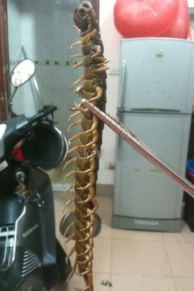 Ngày 23.10.2012, đang dọn nhà, anh Mai Văn Tuyên và anh Triệu Cao (thôn Hành Chính, xã Yên Lâm, huyện Yên Định, Thanh Hóa) bất chợt thấy con rết lớn rơi từ mái nhà xuống ngay trước mặt.