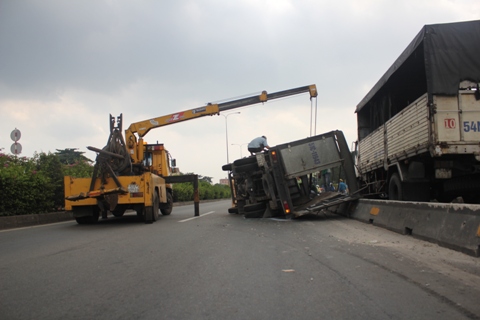 Xe tải lật nhào, 'bom' gas lăn trên quốc lộ 1A