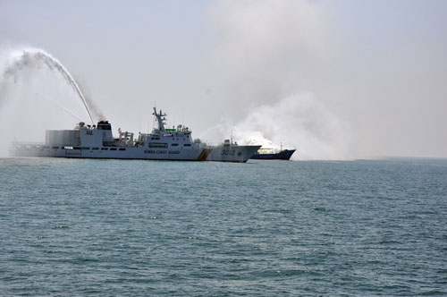 Tàu cảnh sát biển Việt Nam - Hàn Quốc phun vòi rồng chữa cháy