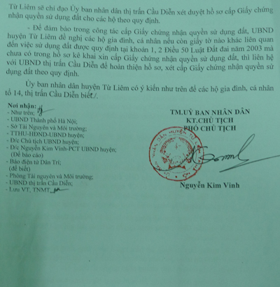 Phải mất đến hơn một năm sau, ngày 23/7/2012, UBND huyện Từ Liêm mới ra được văn bản số 1003/UBND-TNMT gửi UBND TP. Hà Nội; Sở Tài nguyên & Môi trường (TN&MT) đề nghị xem xét giải quyết nguyện vọng được cấp sổ đỏ của các hộ dân tại tổ 14 thị trấn Cầu Diễn, huyện Từ Liêm. Nội dung văn bản của huyện Từ Liêm tiếp tục khẳng định các hộ dân khu vực này đã mua lại đất tự sử dụng phân chia từ trước ngày 15/10/1993.