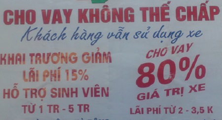 Tương tự, tại cửa hàng cho vay không thế chấp V - H (quận Hà Đông, Hà Nội), chúng tôi được nhân viên ở đây "tư vấn", anh muốn vay bao nhiêu tiền cũng được. Hiện tại bên em đang khuyến mại giảm lãi phí 15%, xuống còn 3.000 đồng/ngày/1 triệu đồng. Hết thời hạn này sẽ lên mức 3.500 đồng. Điều phải lưu ý đó là bên này không cầm tài sản của khách, vẫn do khách bảo quản, sử dụng bình thường.