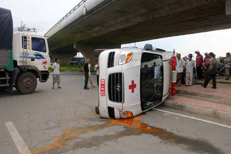 Xe tải tông lật xe cứu thương, hai người nguy kịch
