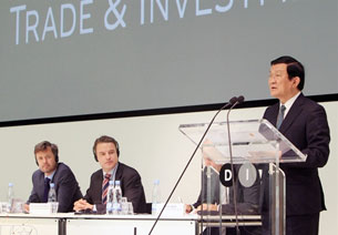 Chủ tịch VN Trương Tấn Sang phát biểu tại Diễn đàn Doanh nghiệp Đan Mạch - Việt Nam hôm 20/9/2013 tại Đan Mạch/AFP photo