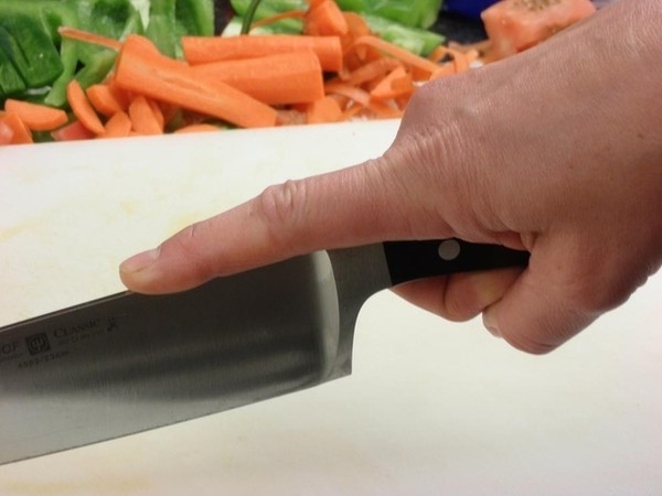 Chứ không đặt ngón trỏ trên sống dao như thế này: