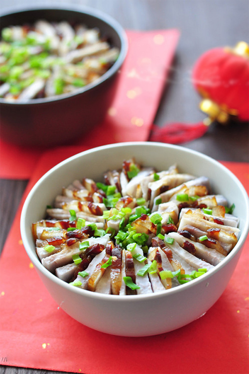 Hành rửa sạch, thái nhỏ. Chuẩn bị nồi hấp, đặt bát thịt và khoai môn vào nồi hấp khoảng nửa tiếng cho khoai chín mềm. Mang bát thịt ra khỏi nồi, rắc hành lên trên và dùng nắp hoặc một chiếc đĩa đậy nắp bát lại ngay khi còn nóng. Hơi nóng còn lại sẽ tự làm chín hành.