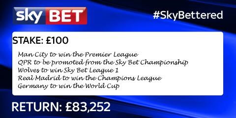 Vị khách này đánh "con xiên 5" gồm các sự kiện sau: Man City sẽ vô địch Premier League, Queen Park Rangers thăng hạng từ Championship, Wolves vô địch giải hạng 3 Anh, Real Madrid vô địch Champions League và cuối cùng là Đức vô địch World Cup. Cả 5 "kèo" này đã trở thành sự thật và nhân số tiền đặt cược của vị khách này lên 830 lần. Tổng số tiền mà người này đầu tư cho canh bạc của mình chỉ là 100 bảng Anh - tức là khoảng 3,6 triệu đồng.
