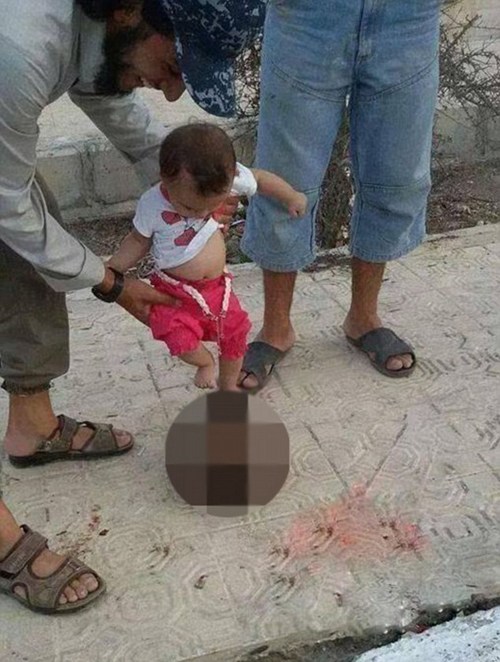 Mới đây, một bức ảnh bệnh hoạn đã được tung lên mạng xã hội như để khoe chiến tích và sự độc ác hiếm có của “dòng máu Jhadi”. Bức ảnh cho thấy một chiến binh thánh chiến trong trang phục dân thường, cho một đứa trẻ nhỏ đá vào đầu của một binh sĩ Syria bị cắt rời.