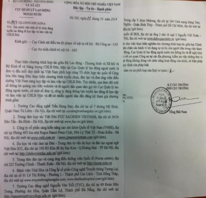 Trước phản ứng của trường Nguyễn Văn Trỗi và Trần Hưng Đạo, sau khi đối chiếu với tài liệu cũng như thu thập của PV, có thể khẳng định, thứ nhất, trường cao đẳng Nguyễn Văn Trỗi có tên trong 9 đơn vị mà Cục Quản lý lao động ngoài nước (QLLĐNN), Bộ LĐ,TB&XH gửi Bộ Công an xác minh, làm rõ những việc làm không đúng của trường này trong hoạt động đào tạo nghề, hợp tác lao động với nước ngoài. Văn bản này do ông Tống Hải Nam, Phó cục trưởng Cục QLLĐNN ký.