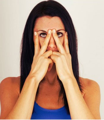 Bước 1: Nhấn hai ngón giữa vào giữa hai lông mày, hai ngón trỏ đặt ở góc ngoài cùng của mắt. Bước 2: Nhìn lên trần nhà, dùng tay nâng mạnh mí mắt lên, sau đó thả lỏng tay. Bước 3: Lặp lại liên tiếp 6 lần và kết thúc bằng cách nhắm mắt, siết chặt tay trong 10 giây.