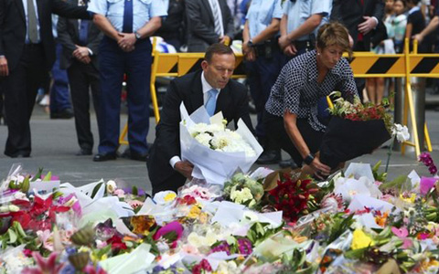 Trước đó, Thủ tướng Abbott đã cùng vợ mang vòng hoa tưởng niệm những nạn nhân của vụ bắt cóc con tin ở Martin Place, quận thương mại trung tâm Sydney.