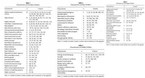 Dựa theo bảng thống kê trên, rõ ràng là có sự liên kết giữa thứ tự trong gia đình và đặc điểm cá nhân cũng như sở thích nghề nghiệp. Một nghiên cứu hồi năm 2001 cũng chỉ ra rằng những đứa trẻ sinh sau thường đi theo khuynh hướng nghệ thuật và các nghề có liên quan đến tính hướng ngoại. Trong khi đó, những đứa con một và con đầu lòng thường theo đuổi những gì thuộc về trí tuệ. Đồng thời, các nhà nghiên cứu không nói rằng đây là một vấn đề bẩm sinh hay di truyền. Họ cho rằng đây là kết quả bởi sự định hướng của cha mẹ.