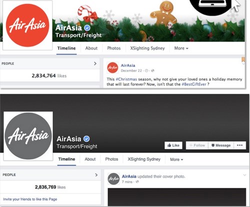 AirAsia thay đổi màu sắc logo và ảnh nền Facebook sau sự cố máy bay mất tích.