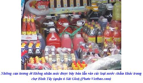 Những can tương ớt không nhãn mác được bày bán lẫn vào các loại nước chấm khác trong chợ Bình Tây (quận 6 Sài Gòn).(Photo Vietbao.com)