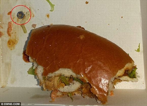 Cô bàng hoàng khi thấy vật thể lạ đã làm mình sứt răng là một chiếc đinh vít trong miếng bánh mà cô vừa cắn.