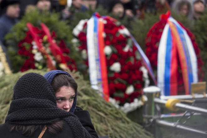 Một phụ nữ đang an ủi cô Zhanna Nemtsova trong đám tang của ông Boris Nemtsov diễn ra vào ngày 3/3.