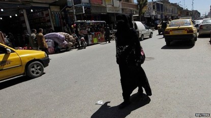 Phụ nữ Syria sống trong khu vực do IS kiểm soát phải mặc bộ đồ che kín từ đầu đến chân mới dám ra đường.