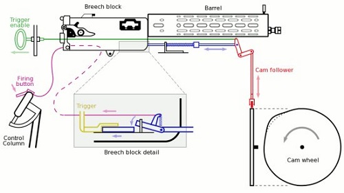 Fokker đặt tên cho phát minh là Zentralsteuerung (kiểm soát trung tâm) và trái tim của cả hệ thống là một bánh cam được gắn và quay với trục xoay của cánh quạt động cơ. Đầu tiên khẩu súng được gắn trước buồng lái và nạp đạn, sau đó phi công kéo một tay cầm để mở cò súng. Tay cầm này sẽ hạ một chiếc cần dẫn xuống bánh cam (cam follower). Chiếc bánh cam này có thiết kế không tròn hẳn mà có một chỗ lồi. Mỗi khi bánh cam quay theo vòng quay của cánh quạt, phần lồi sẽ đẩy cần dẫn hướng lên khiến thanh nối với cò bị đẩy về sau, kích hoạt khẩu súng giống như khi chúng ta dùng ngón tay siết cò. Phần lồi trên bánh cam được thiết kế và lắp tại một vị trí sao cho cò súng chỉ được kích hoạt khi cánh quạt động cơ không chắn đường đạn theo chuyển động quay.