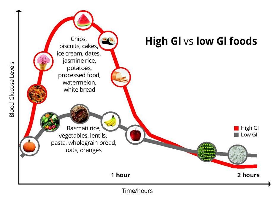 Cách tốt nhất để có sự cân bằng lành mạnh là đảm bảo sao cho chế độ ăn có nhiều các thực phẩm GI thấp. Chỉ nên ăn ở mức độ vừa phải những thực phẩm có GI trung bình, như chuối, xoài hoặc kem lạnh, vì những phần ăn lớn hơn sẽ khiến chế độ ăn bị rối loạn, khiến bạn dễ tăng cân hoặc mất kiểm soát đường huyết.