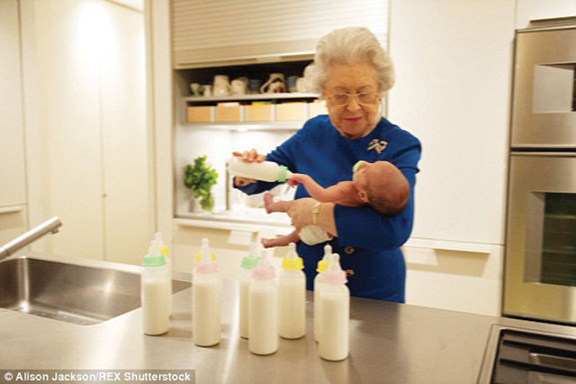 Sau khi hỏi thăm cháu nội William và cháu dâu Kate, Nữ hoàng đã đi thẳng vào nhà bếp để thể hiện sự quan tâm của bà cố đối với tiểu công chúa. Đầu tiên Nữ hoàng kiểm tra bình sữa. Sữa được hâm nóng trong lò vi sóng. Sau khi chắc chắn sữa ở độ ấm thích hợp cho đứa cháu vài ngày tuổi, Nữ hoàng đã đưa bình sữa vào miệng của tiểu công chúa đang đói.