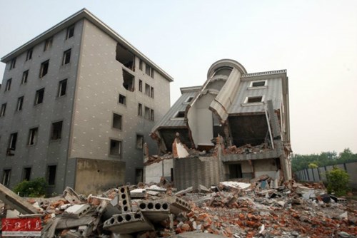 Tờ Shanghaiist đưa tin về một tòa nhà bị sập ở Trung Quốc diễn ra một cách chóng vánh bất thường. Cụ thể, tòa nhà ba tầng này bỗng nhiên bị gãy đôi giữa tầng một và tầng hai khiến hai tầng trên cùng bị đổ sập. Sau khi đổ sập, hai tầng trên của tòa nhà dường như vẫn còn nguyên vẹn trong khi tầng một thì tan nát.
