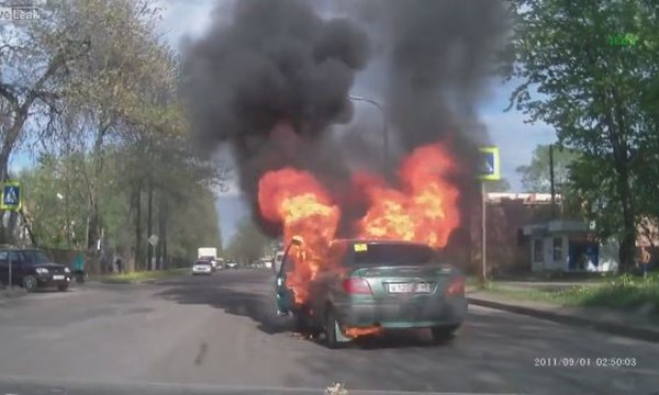 Một chiếc xe đang lưu thông trên đường phố nước Nga bỗng đột ngột bốc cháy ngùn ngụt. May mắn nữ tài xế đã kịp thoát khỏi xe trước khi lửa cháy dữ dội. Tuy nhiên cô gái này đã bị hoảng loạn và được đưa vào một nhà dân cạnh đó để sơ cứu. Vụ tai nạn xảy ra đã được camera hành trình của một chiếc xe chạy trên đường ghi lại.