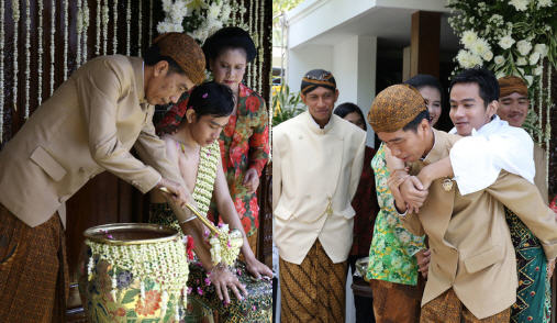 Gibran Rakabuming Raka (phải), con trai ông Widodo, tối qua uống nước do mẹ vợ đưa, trong lễ gột rửa truyền thống của người Java ở thành phố Surakata, Trung Java. Anh sẽ cưới người bạn gái lâu năm Selvi Ananda hôm nay. Surakata là thành phố quê hương của tổng thống.