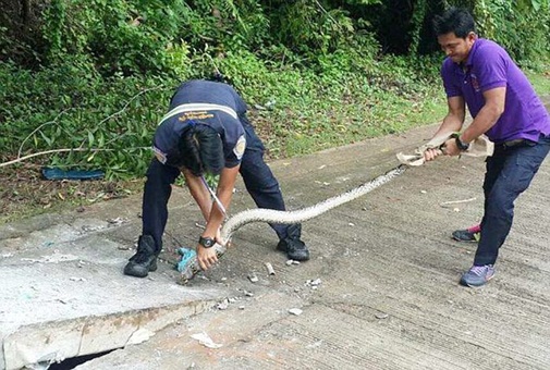 Một con rắn khổng lồ được tìm thấy trong tình trạng đang mắc kẹt trong một cái nắp cống ở Thái Lan. Một người lái xe đã phát hiện ra con rắn và ngay lập tức báo cho cứu hộ, đồng thời đứng bảo bệ con rắn bởi ông lo sợ sẽ có xe chạy qua không may chèn lên người nó.