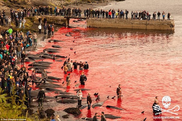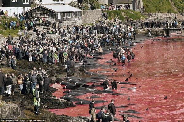 Đó là vùng biển Đan Mạch trong lễ hội thảm sát cá voi. Đây là hành động quá ác của con người nhưng vẫn được nước nayg duy trì, thậm chí những người bảo vệ động vật can thiệp còn bị bắt giữ. Hình ảnh xác những con cá voi nằm chết la liệt, màu máu "nhuộm" đỏ cả một vùng biển rộng trên quần đảo Faroe, Đan Mạch khiến người xem không khỏi rùng mình.