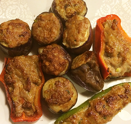 Món này dùng rau trái legume đủ loại nên tạm gọi là “thập cẩm”: cà tím, ớt chuông xanh đỏ, ớt Mễ xanh lợt, cà chua đỏ. Các món rau trái legume này có đủ màu nên dĩa thức ăn trông thật đẹp mà lại hợp với cách ăn uống lành mạnh là nên có càng nhiều màu thì càng tốt vì sẽ có đủ loại vitamin và khoáng chất hơn là chỉ một màu. Món nhồi vào các loại trái này là chả cá thác lác. Chúng ta có thể mua loại chả cá làm bằng các loại cá khác nhau như dĩ nhiên sẽ không ngon bằng chả cá thác lác.