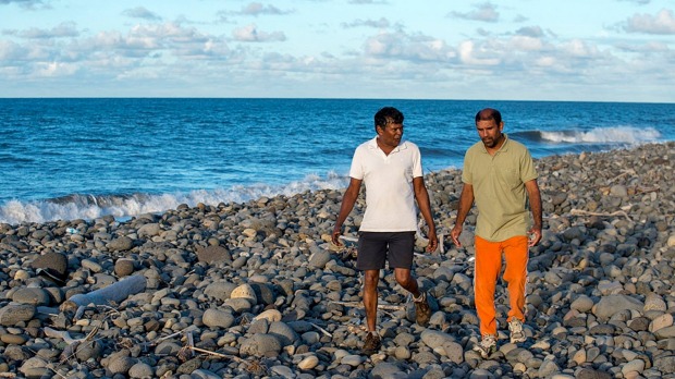 Ông Johnny Begue (phải) - người tìm thấy mảnh vỡ máy bay nghi thuộc MH370 đi bộ cùng bạn trên bãi biển Saint-Denis
