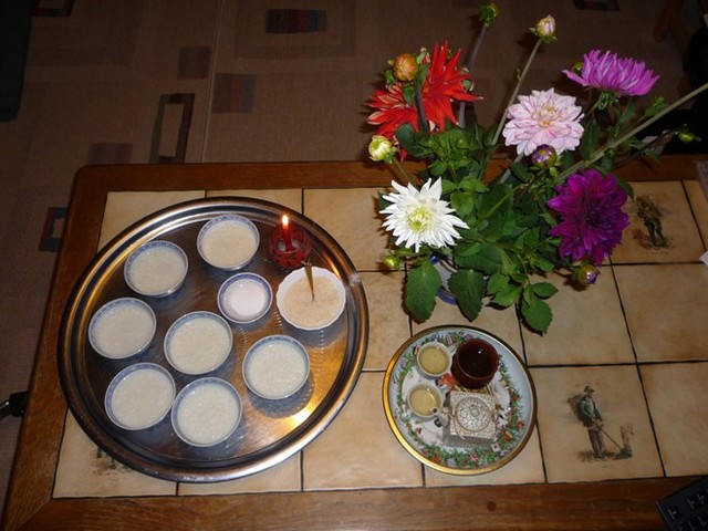 Cháo và mâm gạo muối (5 bát, 5 đôi đũa hoặc thìa).