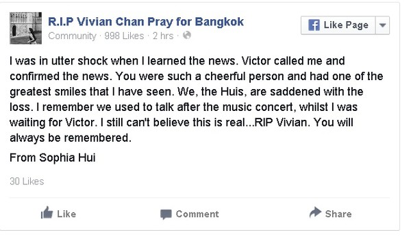 “Tôi hoàn toàn bị sốc khi biết được tin về bạn. Bạn là một người vui vẻ và nụ cười tươi nhất mà tôi từng gặp. Tôi nhớ rằng chúng ta đã từng trò chuyện sau buổi hoà nhạc. Tôi vẫn không thể tin điều này là sự thật. Vĩnh biệt Vivian. Chúng tôi sẽ luôn nhớ đến bạn.