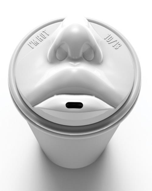 Nắp đậy cốc cà phê*“Take kiss out” có thể giúp chúng ta vừa thưởng thức một cốc cà phê vừa tận hưởng một nụ hôn ngọt ngào vào bất cứ thời gian nào trong ngày. Tác giả của sản phẩm độc đáo là nhà thiết kế Hàn Quốc Jang Wooseok. Ông đã nảy ra ý tưởng này khi đang ngồi trong một quán cà phê.