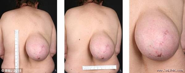 Suốt 10 năm qua, người phụ nữ sống tại thành phố Dublin, Ireland phải mang bầu ngực ở lưng, thật vô cùng đáng thương. Thực ra đó là khối u to bằng ngực. Bị như vậy nên cô gặp nhiều khó khăn trong cuộc sống.